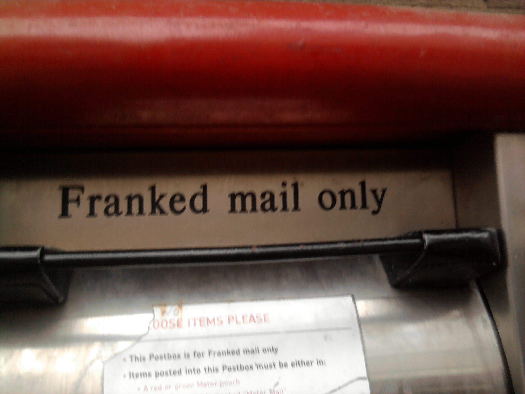 It turns out ‘franked mail’ or ‘franking’ are authorised forms of marking that qualify mail to be posted. Or something.