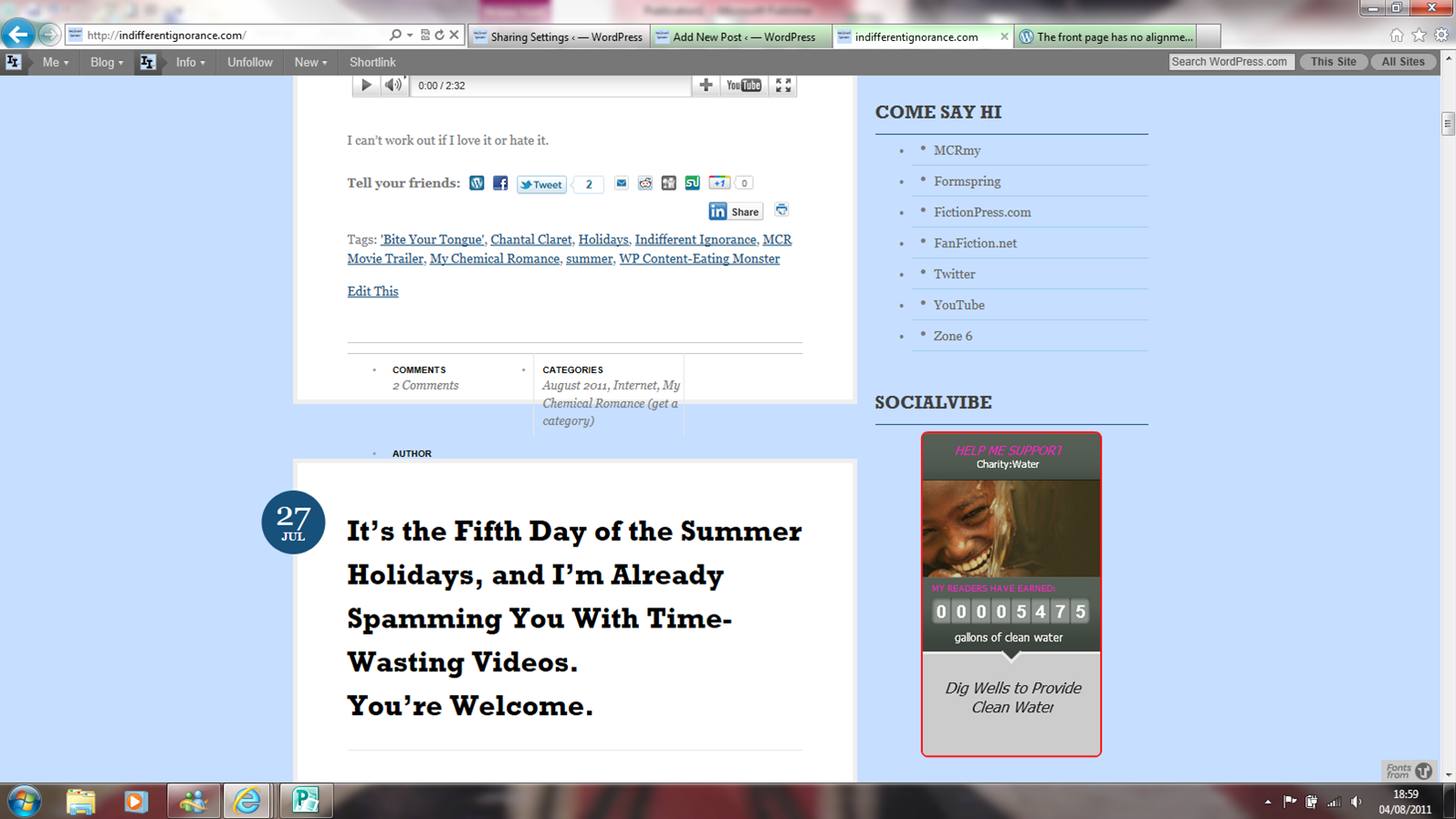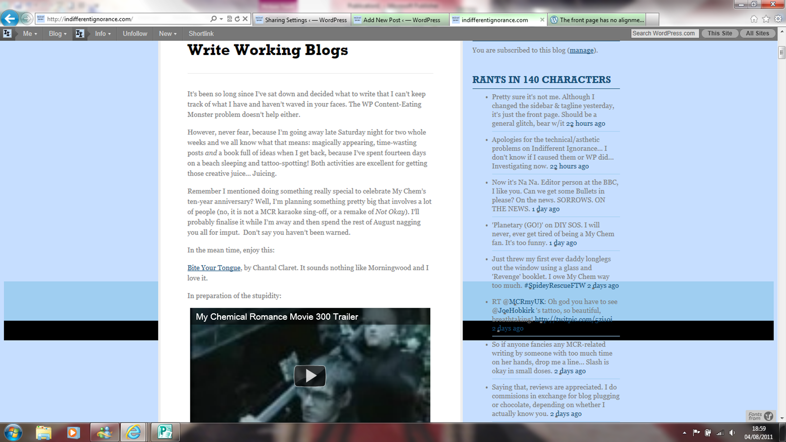 At first I thought the problems were from me changing the tagline and sidebar a bit, but then I realised it’s only affected the front page. Then, on the advice of a nice person on the WordPress Support forum, I tried downloading a newer version of Internet Explorer, thinking my browser might need updating. But apparently I’ve already got the newest version. The funny thing is, when I click ‘preview’, the proper format comes up…