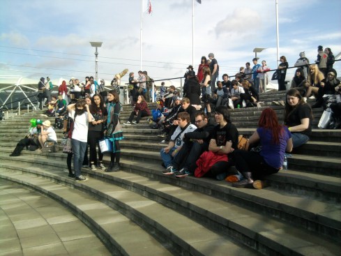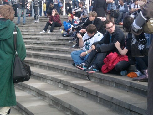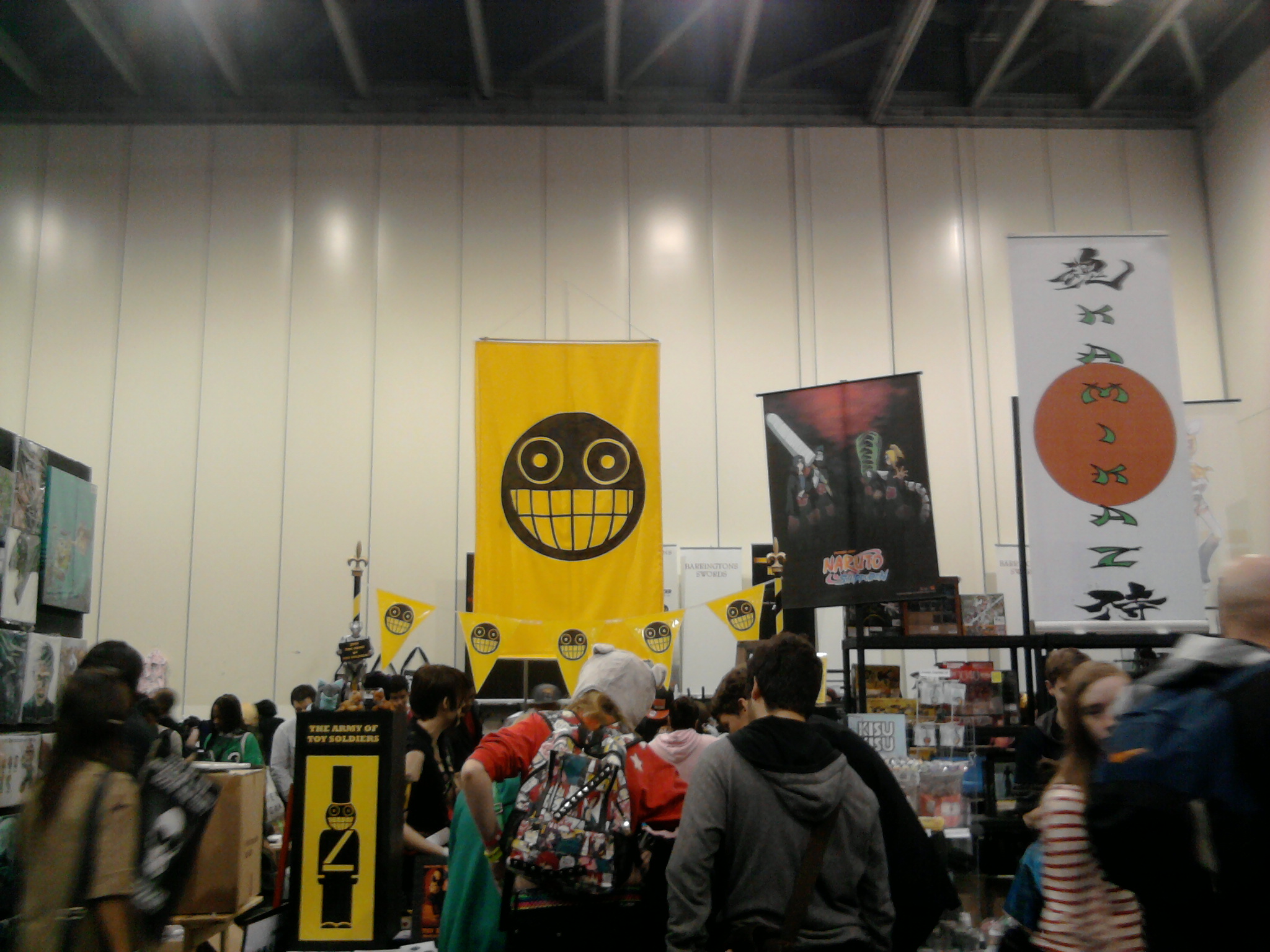 We saw at least one Fun Ghoul, about thirty Matt Smith Doctors, maybe ten David Tennant Doctors and a whatshisface-with-a-scarf Doctor. At one point two Matt Smiths and a David Tennant chased each other round the grass, attacking other Doctors as they went. I don’t read manga, but I learnt to recognise various wigged-and-robed characters as we went around various money-swindling stools. A hint to members of the public, however: wearing hotpants, bras and short skirts when they don’t fit or aren’t made for your sex is really scary. Please carry around signs to warn us.