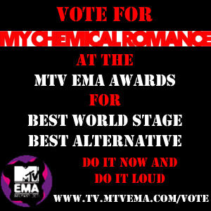 Do you all remember when I told you all to vote for MCR at this year’s European Music Awards? Well, you clearly all ignored me, since 30 Seconds To Mars won both categories, but no matter. The point is, I entered a mini-competition on the MCRmy boards to design a banner that would go on various websites, encouraging people to vote. I played around on Photoshop one evening and made this: