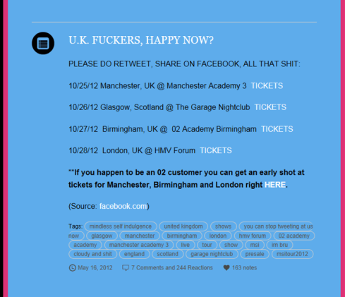 - But now I’ve reached the end of my rant, and all I really want to say is: we’re never happy, fuckers.