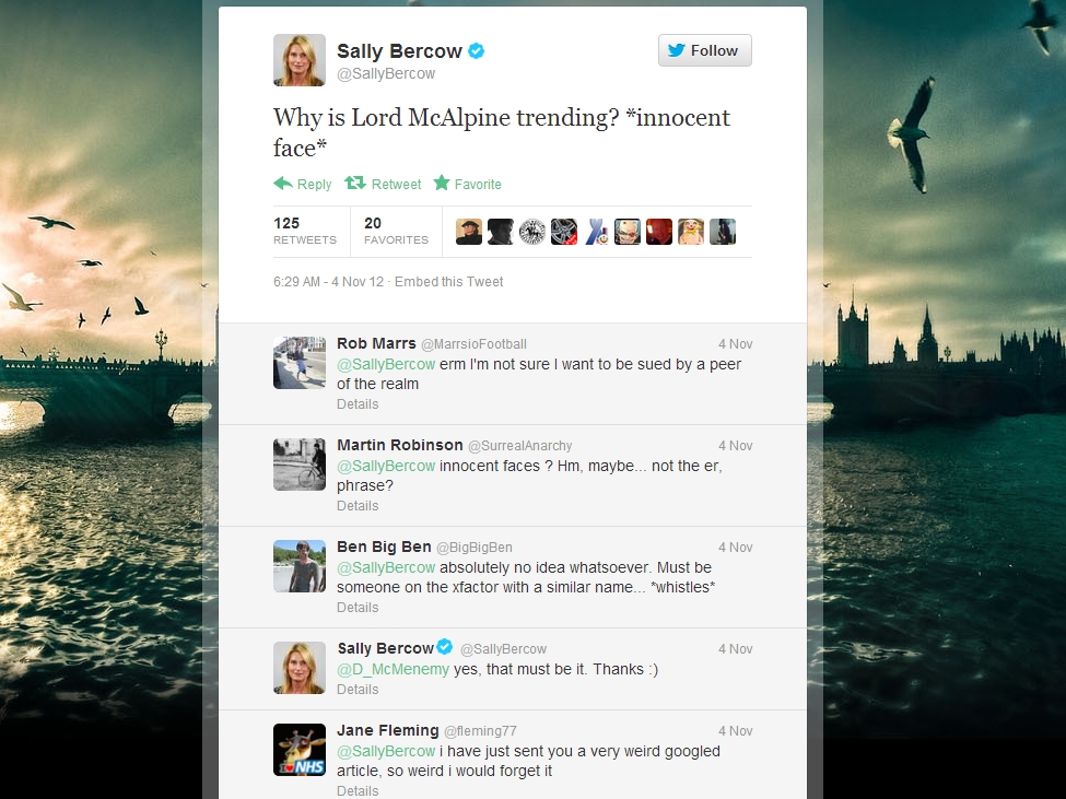 - Don’t break the law. This sounds both stupid and blindingly obvious, but here’s the deal: libel is when you write something untrue about a person, and is basically a criminal offence. The thing with blogging (and this is also true of posting on any other Internet site in existence) is that what you’ve written is there forever/until the electricity, and therefore the Internet, runs out. You can always delete things you regret writing, and the average person won’t be able to access them unless they’ve taken a screen-shot. But there are ways to access deleted, or supposedly hidden, content. Local media laws apply to you as an Internet user – you’re essentially a journalist, even if you’re just commenting on pictures of cats, and you’re expected to behave like one… Take the interesting case of Sally Bercow, who at time of writing is an MP’s wife. She gained minor notoriety posing for a magazine interview in front of the Houses of Parliament wearing nothing but a bedsheet, and gained a court case when she Tweeted this: