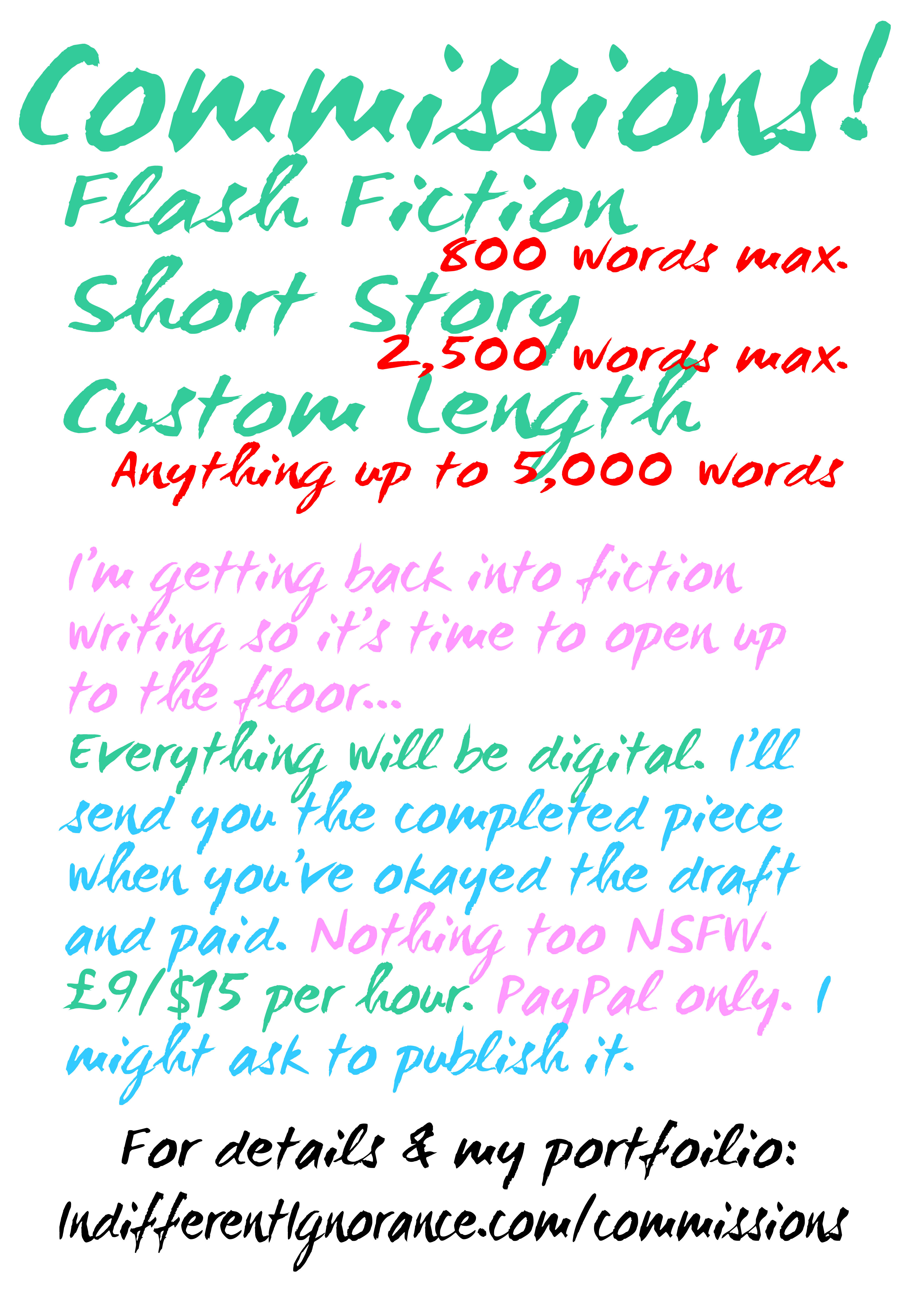 So it’s time to get back in the saddle, as the saying goes, and do some w r i t i n g again! As I mentioned in last week’s stupendous audioblog, I’ve done a some commissions already so now it’s time to expand and do stuff through PayPal (it’s legit, I checked). All the information you need should be here but if you have any questions please let me know ASAP so I can update everything!