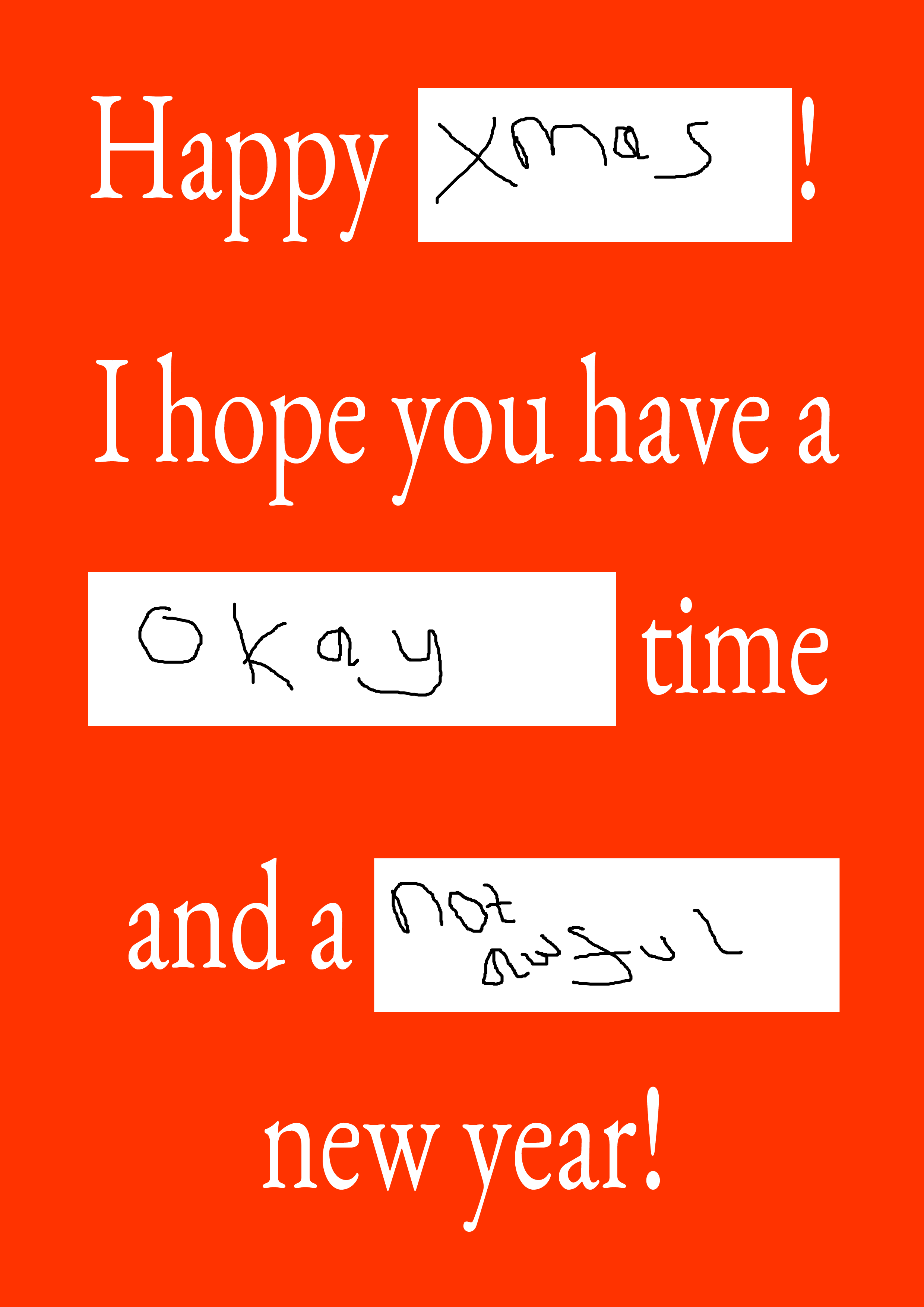 I first got the idea for customisable Christmas/Hanukkah/holiday cards in September or October, but publishing them took a while because the first set had terrible colours and I toyed with using a Photoshop border made of holly. I’m glad I stopped myself from including the holly… Ruby pointed out the colours were reminiscent of basic ye olde Interwebz.