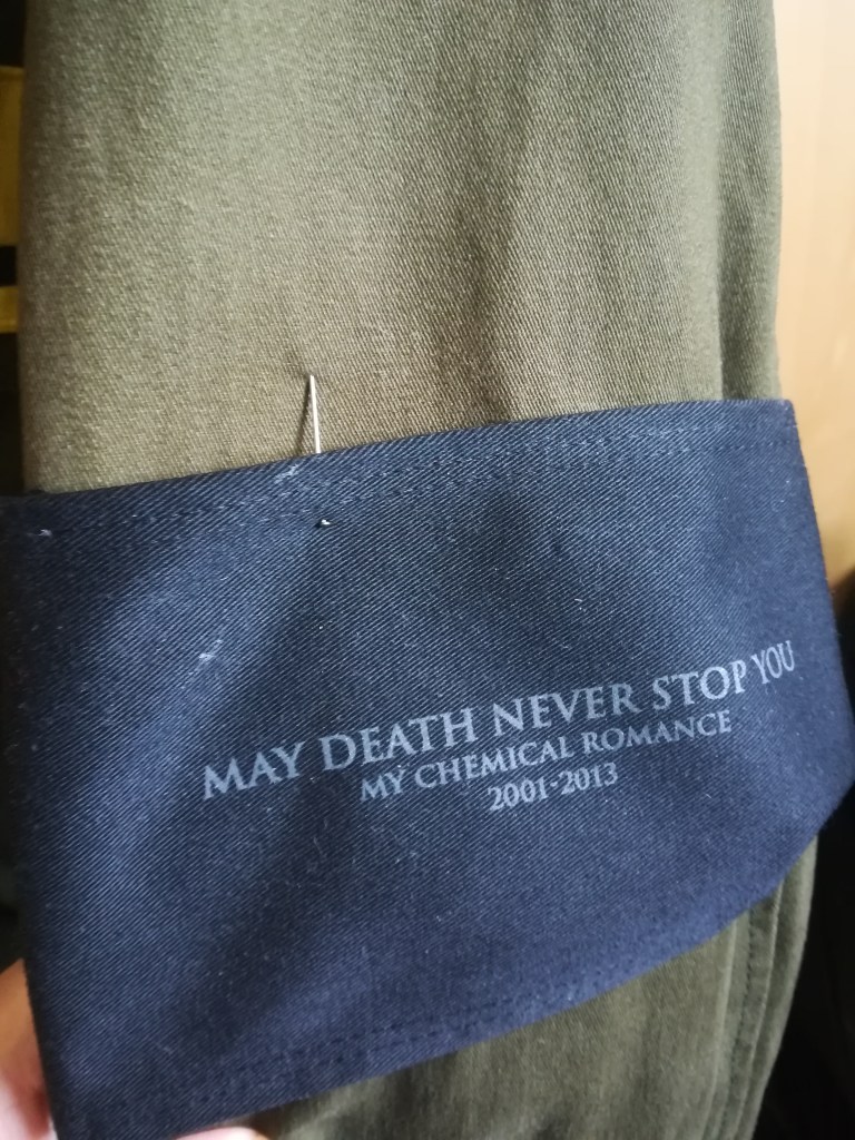 I was under the impression I’d already done a sequel to this post, but I’ve clearly made far less progress on my killjoy jacket than I thought I had. The MCR show I’m making it for is meant to be in June, but I’m pretty sure it won’t happen. Part of me wants another year to get fit enough to dance for 90 minutes and decide what I’m going to put on the back of the jacket, even without the ongoing worry of Covid and vaccinations and which tier I’m in (I can’t remember, I’m assuming it’s a bad one).