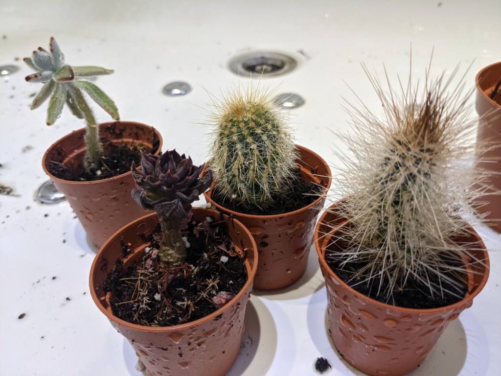 I had to trim back the aloe (not pictured, it’s looking a bit waterlogged as it drains out) after some leaf death. How long are aloes meant to last? This one’s been knocking around for about five years, but what’s left seems okay, with new sprouts. I think I may have done a smidge of overwatering in the summer, because I was watering the same amount as I have during the last couple of summers, when it’s been insanely hot. This summer – sorry, weather again – hasn’t really been like that. The Flaming Katy cutting seems fine, too, minding its own business.